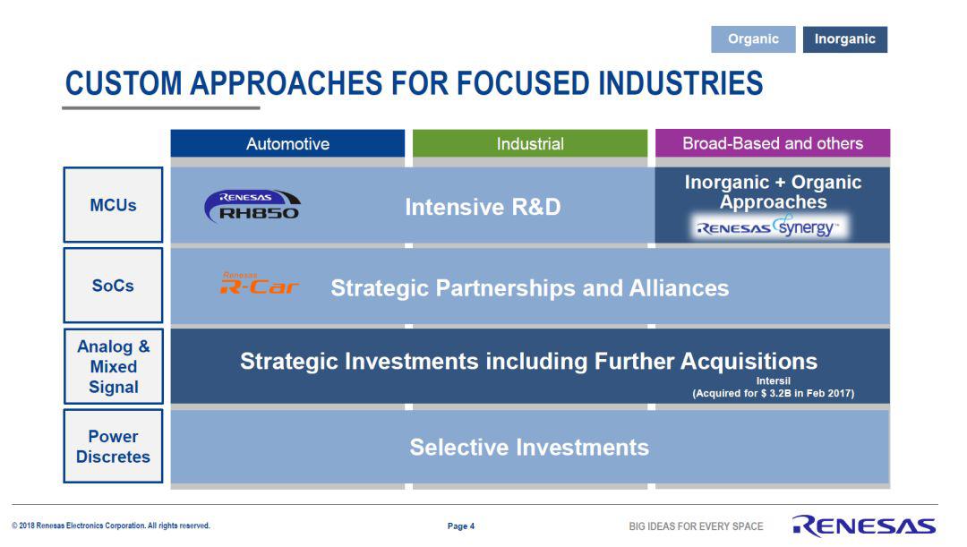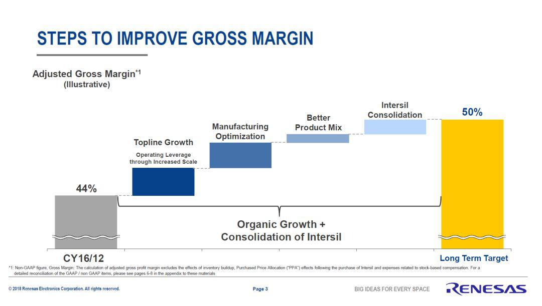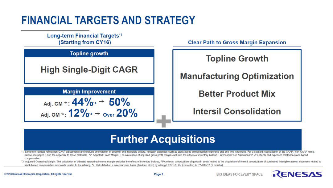 瑞薩電子希望能將毛利率從2016年的44%提高到50%,收購Intersil是其中重要的一步,在2018年二季度財報說明材料中,瑞薩明確表示,將繼續(xù)加大對模擬與混合信號產(chǎn)品的戰(zhàn)略投入,包括必要的收購。