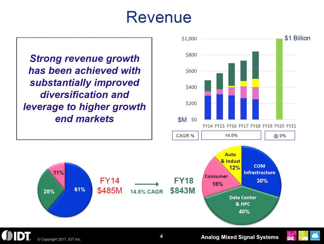 IDT無疑是一個極好的標的:規(guī)模中等,2018財年營收8.43億美元;毛利率高,近年來都在60%以上;增長勢頭良好,2014財年至2018財年復合增長率高達14.8%;技術(shù)與產(chǎn)品符合瑞薩長期戰(zhàn)略規(guī)劃,以模擬與混合信號產(chǎn)品為主,汽車與工業(yè)營收占比約12%,而數(shù)據(jù)中心與通信基礎(chǔ)設(shè)施則將給瑞薩帶來新的客戶資源。