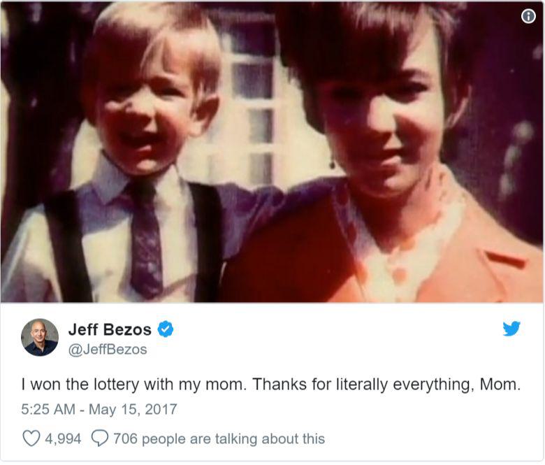 1968年,吉斯和邁克.貝索斯(Mike Bezos)結婚,貝索斯因此被收養(yǎng)。童年貝索斯就展現(xiàn)了非凡的想象力,就像周恩來那句“為中華崛起而讀書”一樣,貝索斯小時候跟老師說:“人類的未來不在這個星球上。”