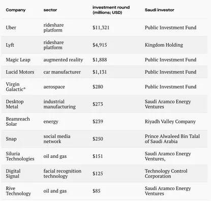 以下是由Quartz整理的沙特參與的最大額融資,其中上榜的包括共享出行行業(yè)巨頭Uber、Lyft,分別名列第一和第二位,其中對Uber的投資高達113.21億美元,對Lyft的投資達到49.15億美元。