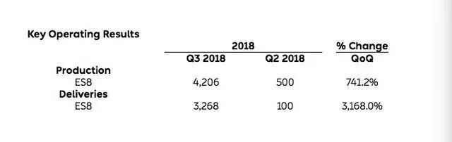在這個第三季度里,蔚來汽車共生產(chǎn)4206輛ES8,比第二季度500輛產(chǎn)量提升74.1%;交付3268輛,較二季度的100輛提升3168.0%。