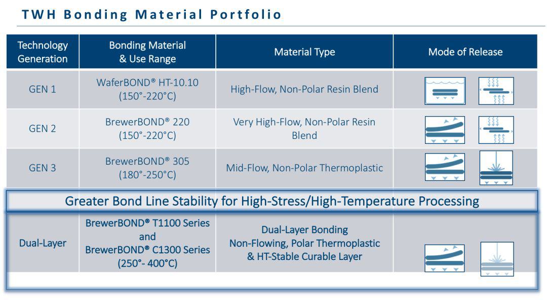 這些需求對(duì)材料商而言也帶來(lái)了新挑戰(zhàn),如臨時(shí)接合材料需耐高溫、容易分離不殘留、更廣泛的熱循環(huán)等,因此專注于協(xié)助客戶進(jìn)入更新制程與封裝技術(shù)的Brewer Science,推出Dual-Layer一代的BrewerBOND® T1100/C1300系列材料,作為因應(yīng)。