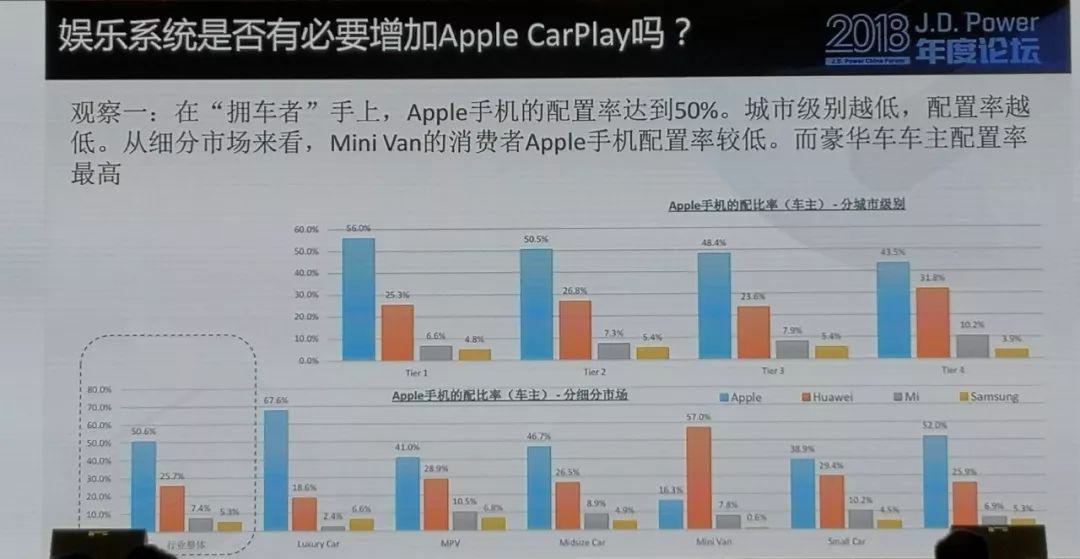 而MobData給出華為手機(jī)用戶多有車有房而蘋果用戶多無房無車的結(jié)論更讓人生疑。至少在汽車這一項,我們可以找到其他數(shù)據(jù)可以佐證。根據(jù)汽車市場調(diào)研公司君迪(J.D.Power)給出的數(shù)據(jù),中國車主配備蘋果手機(jī)的比例超過50%,而華為約為蘋果的一半,比例為25%。