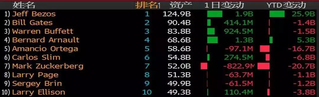 彭博社發(fā)布了最新的彭博億萬富翁指數(shù)榜單:截至2018年12月31日,貝佐斯、比爾·蓋茨、巴菲特是全球排名前三的富翁,身家分別為1249億美元、904億美元、838億美元。受全球金融市場表現(xiàn)不佳沖擊,除了貝佐斯,其他兩位的財富都在2018年縮水。