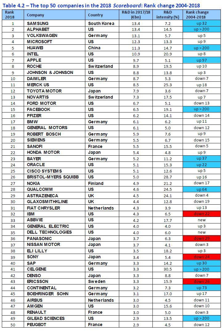 近日,歐盟委員會(huì)的官網(wǎng)發(fā)布了《2018年歐盟工業(yè)研發(fā)投資排名》,其主要是對(duì)全球46個(gè)國(guó)家和地區(qū)的2500家主要企業(yè)2017會(huì)計(jì)年度研發(fā)投入進(jìn)行的調(diào)查。其中,三星以134.37億歐元研發(fā)經(jīng)費(fèi)居榜首,華為以113億歐元的研發(fā)投入排名中國(guó)第一,世界第五。