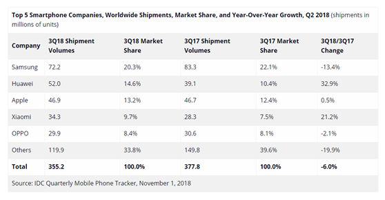 去年11月份,IDC發(fā)布了關(guān)于全球智能手機(jī)供應(yīng)商Q3季度的表現(xiàn),其中三星在同比下降13.4%的情況下依舊排行第一,第二名的華為同比增長(zhǎng)32.9%。究其原因,一方面是智能手機(jī)整體出貨量的下降,一方面是被華為、小米這樣的中國(guó)手機(jī)廠商攻城略地。