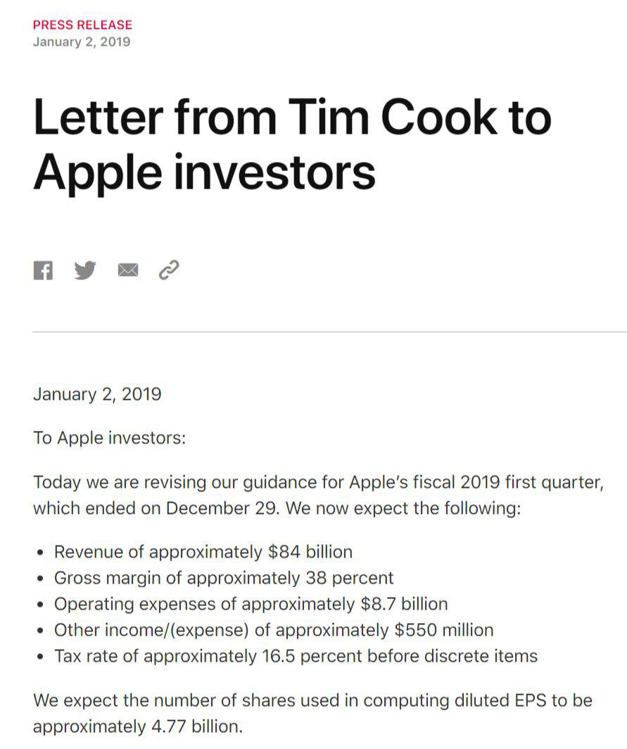 美國時(shí)間周四,蘋果股價(jià)暴跌9.96%,市值一天蒸發(fā)741億美元。前一天,蘋果股價(jià)在盤后交易中暴跌逾7%。這就像一顆驚雷,炸懵了一圈盟友。首先是巴菲特在蘋果發(fā)出銷量下跌警告之后損失近40億美元。此外,蘋果相關(guān)概念股也被濺了一身傷。Qorvo跌9.06%,Skyworks跌超10%,臺積電跌5.91%,西部數(shù)據(jù)跌6.82%。A股中,東山精密閃崩跌停,信維通信跌幅超過8%,立訊精密、超聲電子跌幅均超過4%。港股中,瑞聲科技跌5.41%報(bào)41.05港元,舜宇光學(xué)跌6.76%報(bào)61.40港元。當(dāng)然,這一切似乎都?xì)w因于庫克當(dāng)天發(fā)的一封致投資者的信,其下調(diào)了2019財(cái)年第一季度營收預(yù)期,原因是iPhone更新次數(shù)減少,中國銷售疲軟,這是蘋果近20年來首次下調(diào)營收預(yù)期——第一財(cái)季營收預(yù)期從此前的890億-930億美元下調(diào)至840億美元,低于分析師預(yù)期的915億美元。