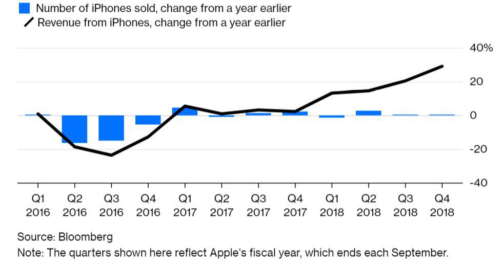 再看iPhone這幾年的策略,如下圖所示,iPhone銷售的數(shù)量一直平穩(wěn),而蘋果從iPhone上賺的錢卻逐年攀升。顯然這是得益于iPhone價(jià)格越來越貴,有一種奢侈品的感覺。