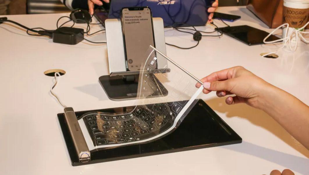 Royole透可折疊QWERTY鍵盤,它可以放置在任何光滑的表面并通過(guò)藍(lán)牙與手機(jī)連接。它可以無(wú)線工作,當(dāng)使用完畢后按兩次按鈕就會(huì)卷起來(lái),這樣使用者就可以隨身攜帶它了。在待機(jī)狀態(tài)下,這款鍵盤據(jù)稱可以使用數(shù)月時(shí)間。
