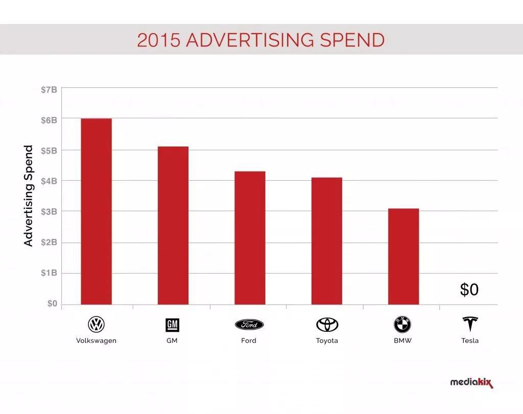 特斯拉的玩法跟傳統(tǒng)車企似乎很不一樣,在做廣告方面,馬斯克幾乎不愿怎么花錢。一份來自Mediokix調(diào)查顯示,2015年知名汽車公司的廣告投入在30–60億美元之間,而特斯拉則是0。在2016年另一項(xiàng)調(diào)查中,研究人員對(duì)比了美國各暢銷車型的廣告成本(平均每賣出一輛車所需的營銷花費(fèi))。其中,現(xiàn)代汽車的高端車型Genesis要投入6821美金,而特斯拉依舊是0。