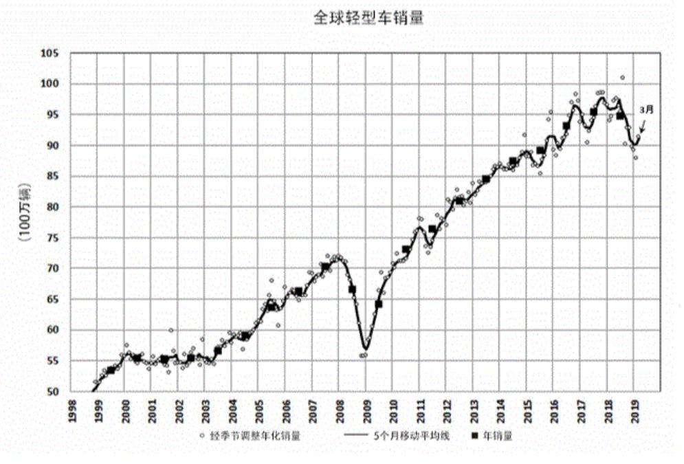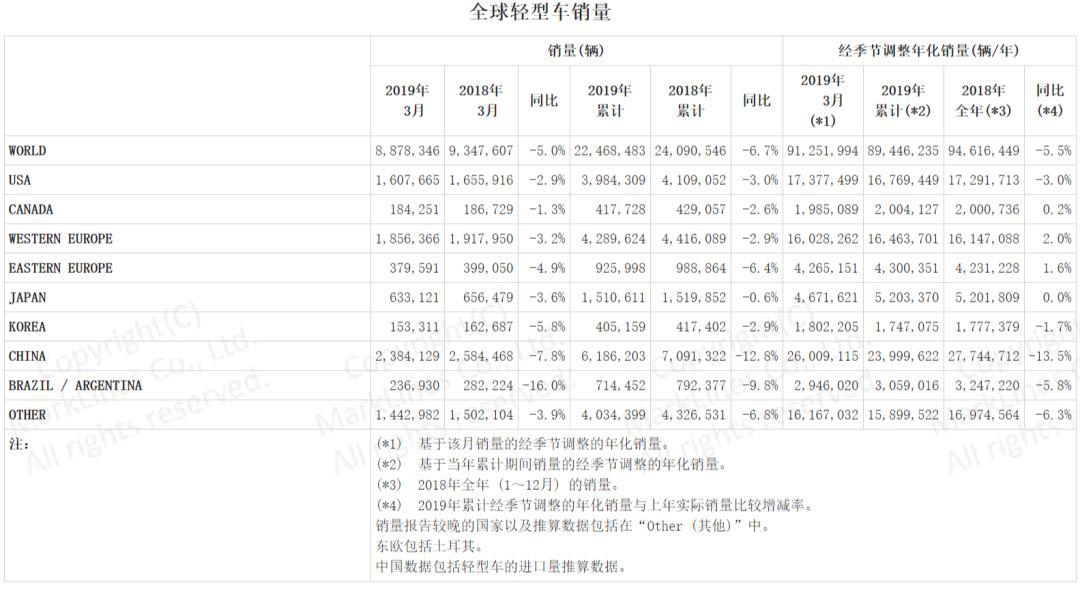 據(jù)LMC Automotive的數(shù)據(jù),2019年3月全球整體輕型車銷量同比下降5.0%。同時,3月經季節(jié)調整年化銷量上升至9125萬輛/年,相比2019年1月和2月略有增長。