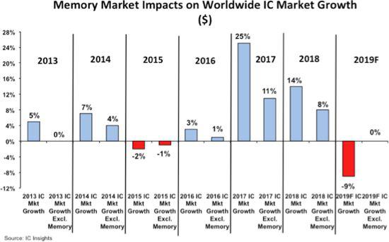另一組來自ICinsights的報告似乎給了解釋。在過去的兩年里,內存市場推動了集成電路市場的總體增長,但很可能在2019年對其增長形成阻礙。