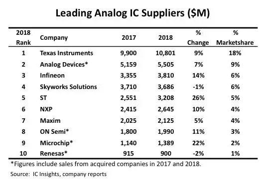 比如,IC Insight前幾日公布了“2018全球模擬芯片廠TOP 10”(如下)。這份榜單讓人頓覺索然無味,除了英飛凌與Skyworks的位置換了一下,其余8家穩(wěn)如泰山,尤其老大TI。此外,10大模擬集成電路供應(yīng)商去年占全球模擬銷售額的60%,即361億美元,而2017年接近61%,約合330億美元。