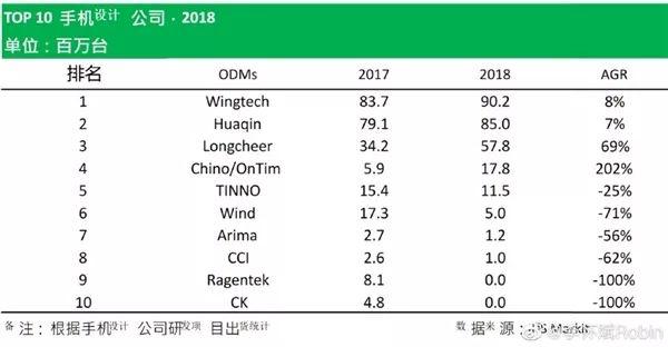 比如,IHS Markitt分析師李懷斌前不久公布了“2018年手機ODM產(chǎn)業(yè)白皮書”,其中Wingtech(聞泰)去年的出貨量達到了9020萬臺,同比增長8%,位列第一。