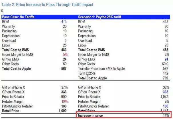 J.P. Morgan發(fā)布報告稱,如果美國真的對中國產(chǎn)品征收25%的關(guān)稅的話,蘋果公司需要將iPhone價格提高14%(如下圖),才能抵消關(guān)稅范圍擴大帶來的不利影響。