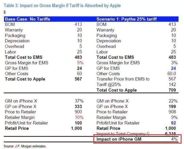 如果不漲價,J.P. Morgan預(yù)計,這對iPhone的毛利率造成的損失為400個基點左右(如下圖所示)。