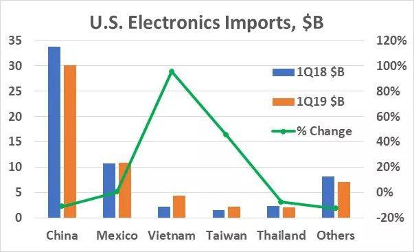 雖為第三大進口來源,但美國電子純粹靠轉(zhuǎn)移到越南也有點“騙騙自己”。雖然在2019第一季度,越南的外國投資增長了86.2%,達到了108億美元,其中中國投資幾乎占到一半。