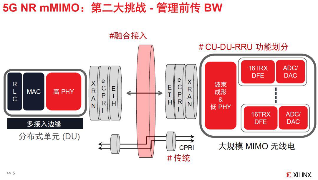 第二個(gè)困難是如何管理前傳帶寬(Fronthaul BW)。Gilles Garcia解釋,4G有CPRI連接。5G引入了XRAN、eCPRI、ETH等協(xié)議,要實(shí)現(xiàn)多協(xié)議支持,達(dá)到“融合接入”,需要有足夠的帶寬及冗余設(shè)計(jì)資源來支持還在逐漸演化的5G協(xié)議。而RFSoC系列產(chǎn)品能夠提供足夠的帶寬及設(shè)計(jì)資源。