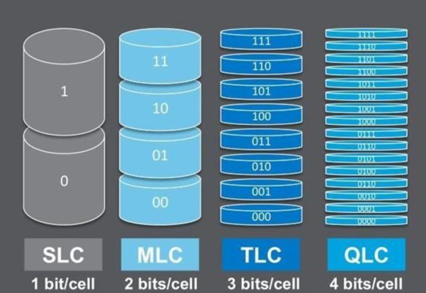 此外,根據(jù)NAND閃存中電子單元密度的差異,又可以分為SLC(單層次存儲(chǔ)單元)、MLC(雙層存儲(chǔ)單元)、TLC(三層存儲(chǔ)單元)以及QLC(四層存儲(chǔ)單元)此四種存儲(chǔ)單元在壽命以及造價(jià)上有著明顯的區(qū)別。