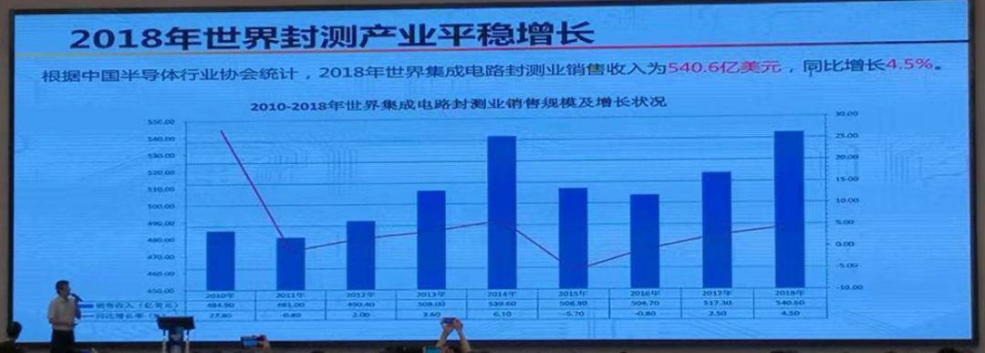 在封測產(chǎn)業(yè)方面,據(jù)中國半導(dǎo)體行業(yè)協(xié)會統(tǒng)計(jì),2018年世界集成電路封測業(yè)銷售收入為540.6億美元,同比增長4.5%。