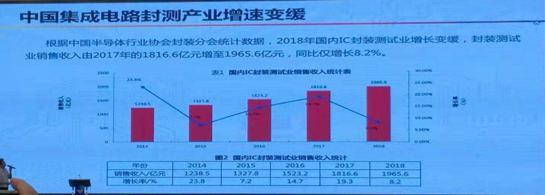 視野回到國內(nèi),據(jù)中國半導(dǎo)體行業(yè)協(xié)會封裝分會統(tǒng)計(jì)數(shù)據(jù),2018年國內(nèi)IC封裝測試業(yè)增長變緩,封裝測試業(yè)銷售收入由2017年的1816.6億元增長至1965.6億元,同比增長8.2%。