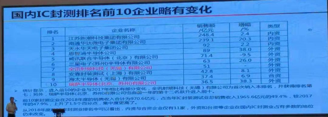 上圖是2018年國內(nèi)IC封測排行十強(qiáng)榜單,統(tǒng)計(jì)顯示,進(jìn)入前10的企業(yè)與2017年相比有部分變化,全訊射頻科技(無錫)有限公司為首次納入本排名,并獲得排名第七;另外,瑞薩半導(dǎo)體(北京、蘇州)有限公司也由前一年的十二名躍進(jìn)前十。