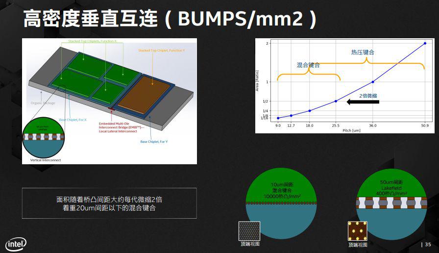 高密度3D封裝,將多芯片封裝從單獨一個平面,變?yōu)榱Ⅲw式組合,從而大大提高集成密度,可以更靈活地組合不同芯片或者功能模塊。Ravi Mahajan表示,現(xiàn)在其間距可做到50微米,英特爾已有先進技術(shù)可將其做到10微米甚至更小,這取決于系統(tǒng)的設(shè)計方法,每平方毫米IO則可以從400到10000來進行選擇。