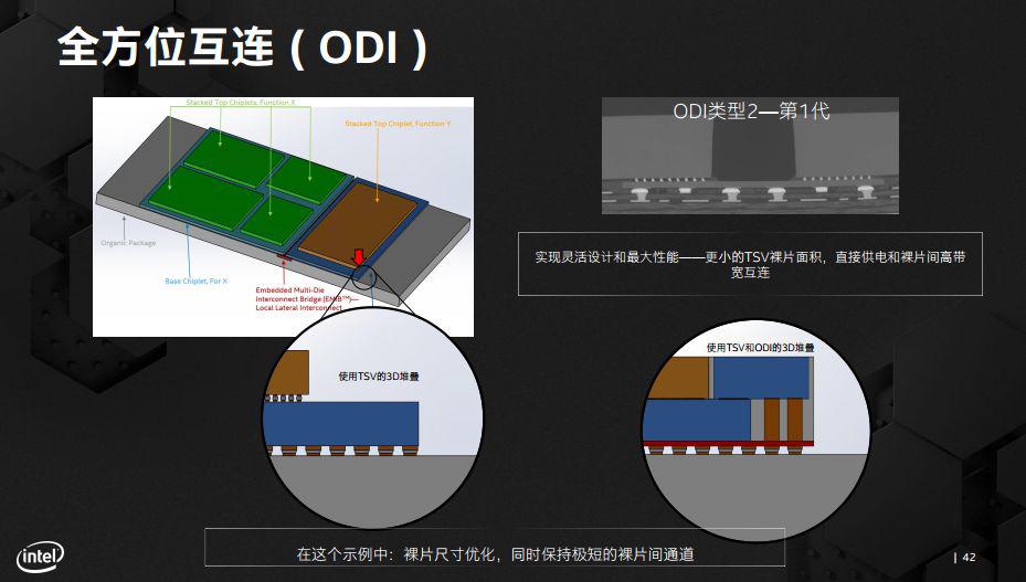 常規(guī)的疊加方式下,基礎(chǔ)裸片要大于上面疊加的所有小芯片的總和,通過ODI技術(shù)可以改變這一點,使得兩者之間更好的協(xié)調(diào),上下做到面積統(tǒng)一。