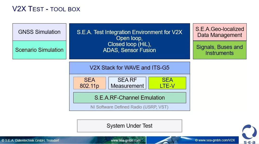 在2019汽車測試博覽會(ATE 2019)同期,NI發(fā)布了S.E.A. C-V2X(Cellular Vehicle-to-Everything)開環(huán)測試系統(tǒng),該系統(tǒng)是NI與德國S.E.A.公司合作,采用NI軟件無線電(SDR)硬件,結(jié)合S.E.A公司軟件,可將實(shí)際信號發(fā)送到C-V2X控制器和遠(yuǎn)程信息處理控制單元上的射頻與GNSS通道。