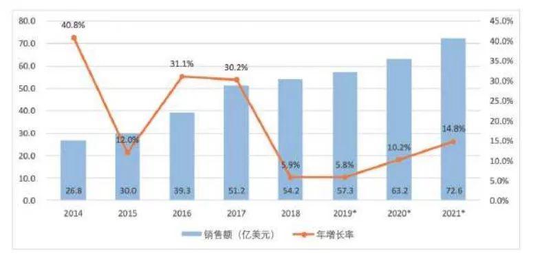 2014-2021年全球服務(wù)機(jī)器人銷售額及增長率
