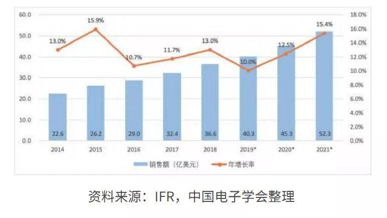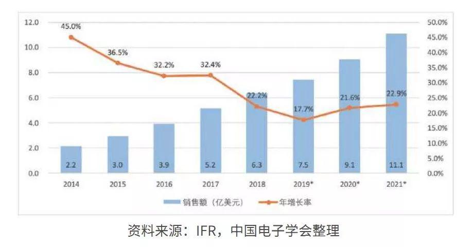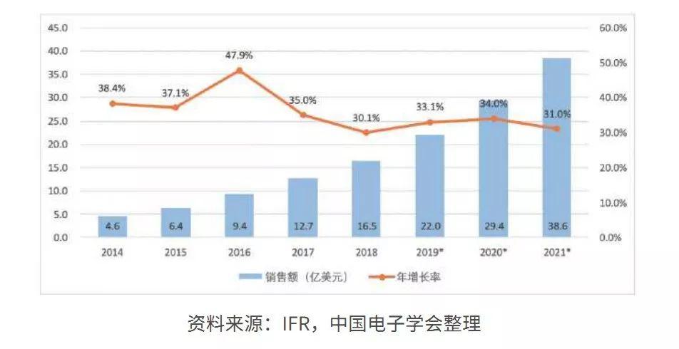另一方面,2014年至2019年,我國機(jī)器人市場平均增長率達(dá)20.9%。上半年,全球機(jī)器人市場規(guī)模達(dá)144億美元,其中中國為42.5億美元,占全球近30%。其中工業(yè)機(jī)器人占57.3億美元,服務(wù)機(jī)器人占22億美元,特種機(jī)器人占7.5億美元。
