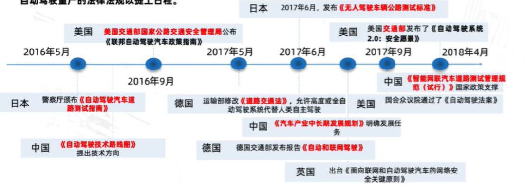 在國(guó)內(nèi),2015年自動(dòng)駕駛提上國(guó)家高度,2016年發(fā)布自動(dòng)駕駛技術(shù)路線圖,2017年發(fā)布汽車產(chǎn)業(yè)中長(zhǎng)期發(fā)展規(guī)則,2018年4月發(fā)布了首個(gè)國(guó)家級(jí)自動(dòng)駕駛路測(cè)文件——《智能網(wǎng)聯(lián)汽車道路測(cè)試道理規(guī)范(試行)》,自動(dòng)駕駛上路測(cè)試合法化:圍繞自動(dòng)駕駛量產(chǎn)的法律以提上日程。