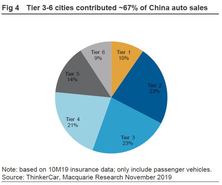圖4:三到六線城市對(duì)中國汽車銷量的貢獻(xiàn)約為67%