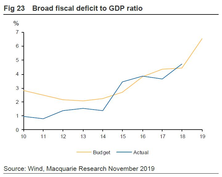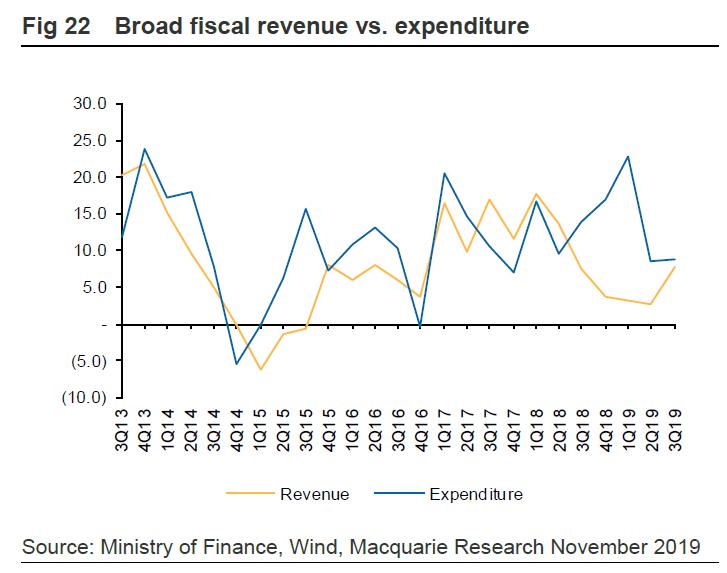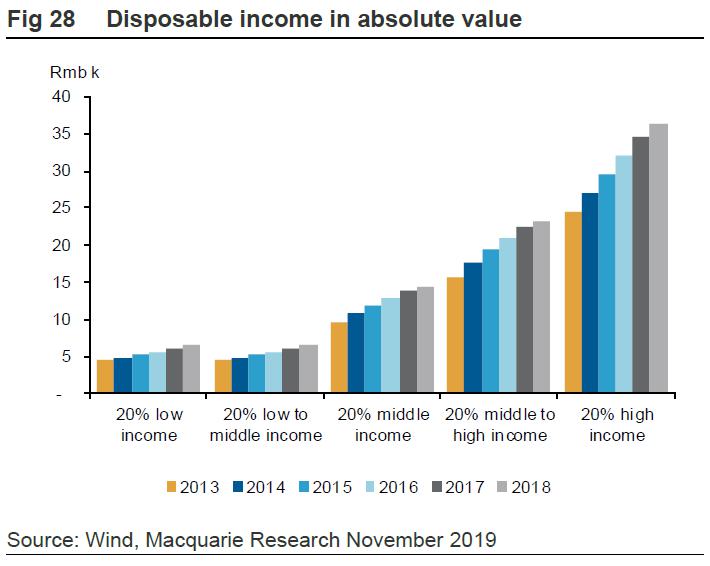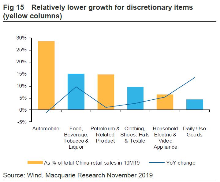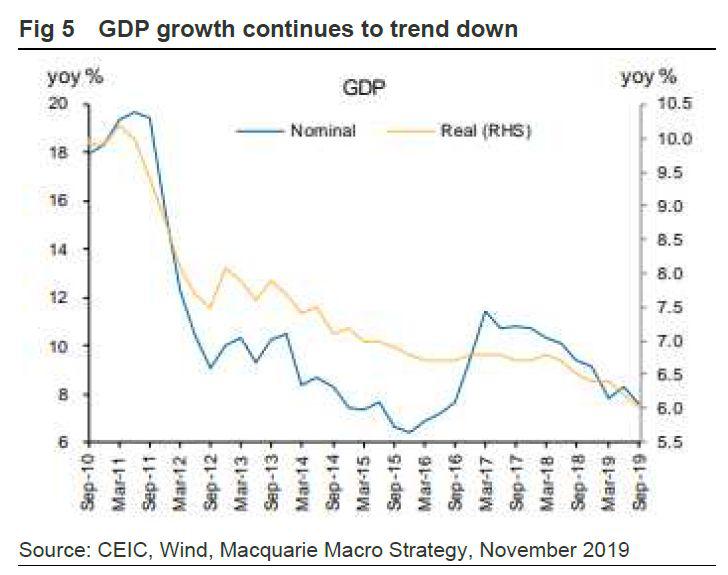 1)持續(xù)的宏觀逆風(fēng),尤其是疲弱的私營經(jīng)濟(jì)自2017年第4季度以來,中國經(jīng)濟(jì)在近八個(gè)季度中一直處于總體下降趨勢(shì)中。麥格理(Macquarie)經(jīng)濟(jì)學(xué)家拉里·胡(Larry Hu)預(yù)計(jì),2018年第四季度實(shí)際GDP增長將從19年三季度的6.0%進(jìn)一步放緩。GDP疲軟也導(dǎo)致可支配收入增長收窄。