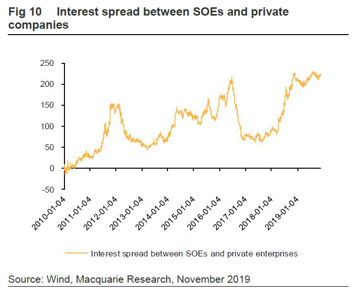 國家統(tǒng)計(jì)局(NBS)將此歸因于上述規(guī)模以上工業(yè)企業(yè)數(shù)量的變化。我們將差異歸因于生存偏差,即更多的私營企業(yè)不能達(dá)到規(guī)模工業(yè)企業(yè)的“門檻”。這可能側(cè)面反映出許多私人公司的規(guī)模在縮小。此外,私營企業(yè)的杠桿比率仍然很高。國有企業(yè)與民營企業(yè)之間的利益差距也達(dá)到了歷史最高水平。