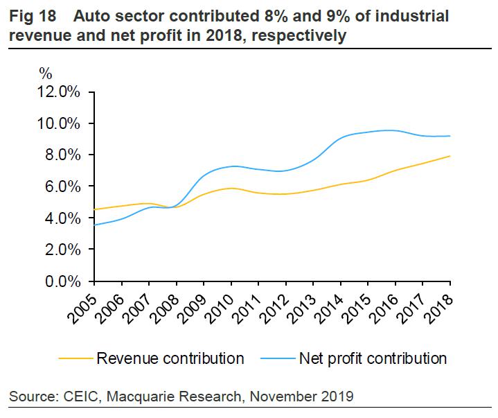 圖18:2018年汽車行業(yè)對(duì)工業(yè)收入和凈利潤的貢獻(xiàn)分別為8%和9%