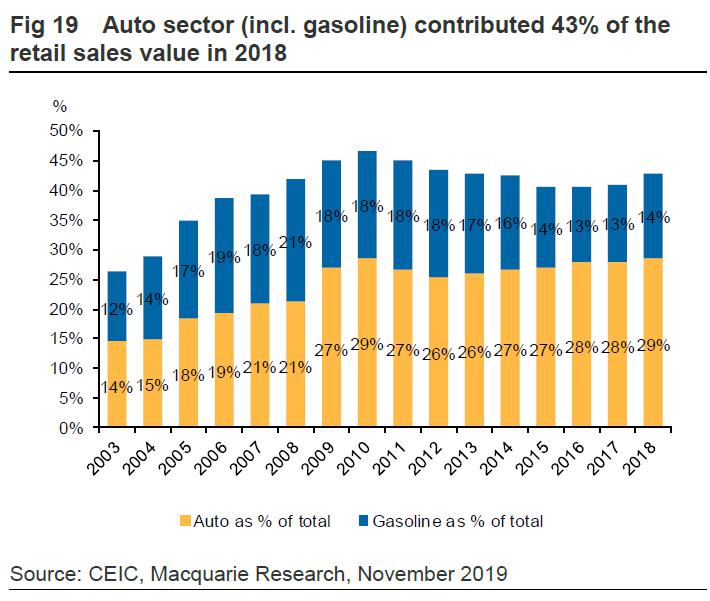 圖19:2018年汽車(包括汽油)占零售總額的43%