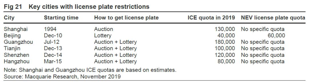 預(yù)計(jì)車牌配額將進(jìn)一步放寬:隨著深圳和廣州牌照配額的放寬,預(yù)估會(huì)有更多城市效仿。2019年,受牌照限制的6個(gè)重點(diǎn)城市的ICE牌照總量約為650k。由于這些城市有很長的車輛等候名單,放松限制措施可能導(dǎo)致需求的迅速釋放。在現(xiàn)有配額的基礎(chǔ)上分別增加50%和100%的情況下,全年乘用車總銷售額將增加1-3%。