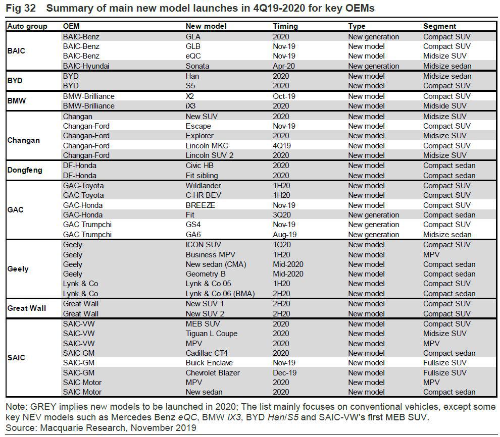 圖32主要制造商在2019-2020年第四季度發(fā)布的主要新車型摘要