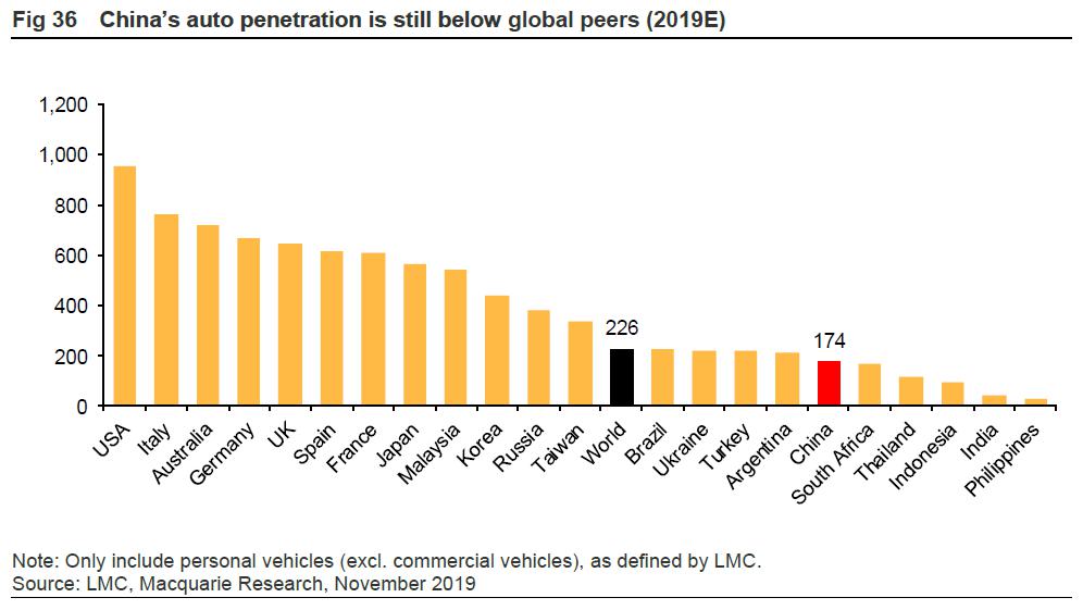 圖36:中國汽車滲透率仍低于全球同行(2019E)