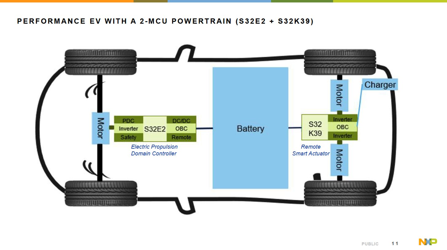 如下圖所示,在汽車中S32E2和S32K39相互間可以進(jìn)行良好的協(xié)作。在前端S32E2可以對電機(jī)進(jìn)行控制,后端S32K39可以對兩臺電機(jī)進(jìn)行控制。得益于S32E可以實(shí)現(xiàn)雙電機(jī)控制的特性,所以雖然只有三個電機(jī),但仍可以實(shí)現(xiàn)四輪驅(qū)動。