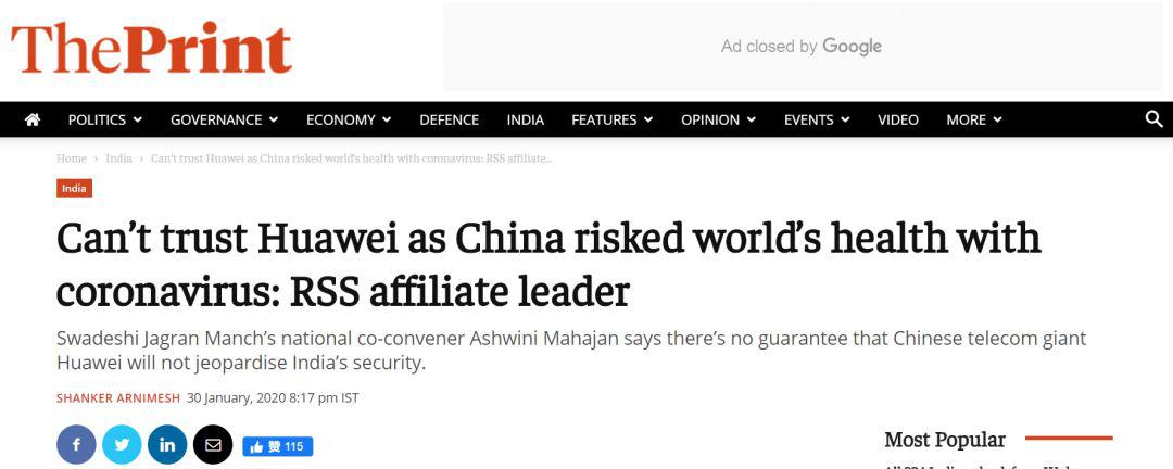但這一口黃連味道還跟庫克口中的不一樣,一家印度媒體“The Print”援引印度政治和文化組織Swadeshi Jagaran Manch的國家召集人Ashwani Mahajan話稱,印度政府不應(yīng)該信任華為,原因居然是“冠狀病毒危害人類健康”,更猜測這是“生物戰(zhàn)的結(jié)果”,還表示“無法保證華為不危及印度的安全”。