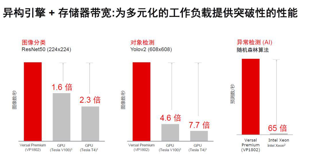 在賽靈思眼中,這是一款懟天懟地對(duì)空氣的產(chǎn)品,在圖像分類上,Versal Premium特斯拉 V100 GPU性能的1.6倍,是特斯拉T4 GPU的2.3倍,對(duì)象檢測(cè)上分別提高了4.6倍和7.7倍,自異常檢測(cè)(隨機(jī)森林算法)上是英特爾至強(qiáng)CPU的65倍。