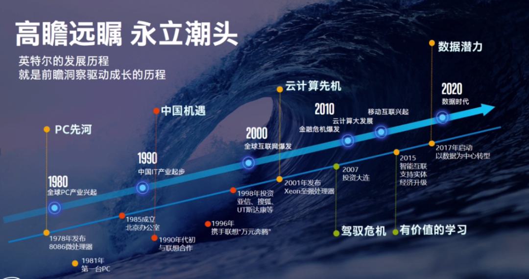 1978年的8086微處理器趕在全球PC產(chǎn)業(yè)興起前;落戶中國的1985年,比中國IT起步早了5年;互聯(lián)網(wǎng)爆發(fā)之際,趕緊掏出Xeon至強(qiáng)處理器;2017年又啟動了數(shù)據(jù)為中心的轉(zhuǎn)型。