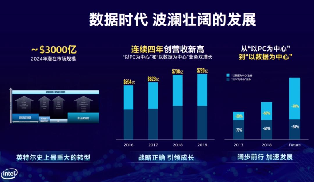 數(shù)據(jù)直觀來看,到2024年潛在的3000億美元市場規(guī)模。對于英特爾來說,其PC為中心業(yè)務(wù)的營收在2018年占5成,未來可能只有3成,剩下的都是數(shù)據(jù)為中心的業(yè)務(wù)收入。