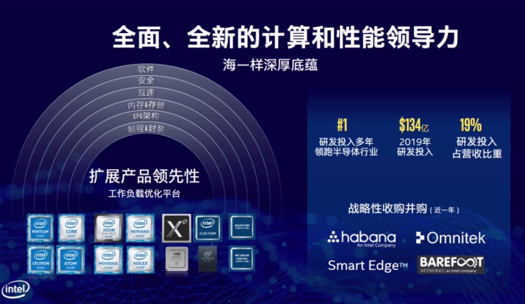 在2019年英特爾研發(fā)投入高達(dá)134億美元,領(lǐng)跑半導(dǎo)體行業(yè),占公司營收19%。其六大技術(shù)支柱并駕齊驅(qū),滿足前所未有的計(jì)算和性能需求;產(chǎn)品線覆蓋云、網(wǎng)、端,并推動量子計(jì)算、神經(jīng)擬態(tài)計(jì)算等未來創(chuàng)新。