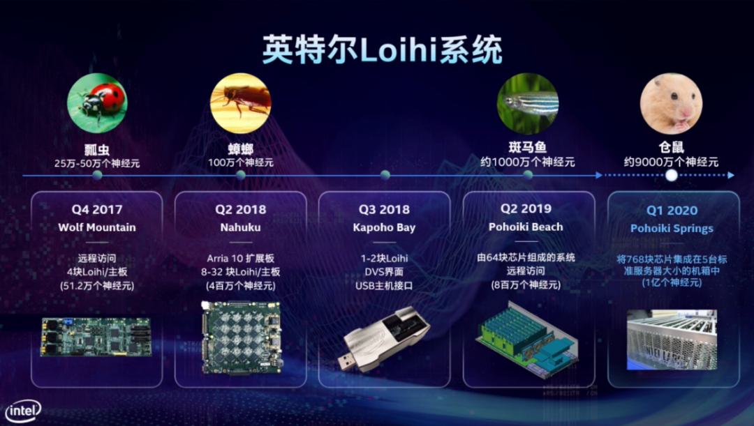 其中英特爾開發(fā)的代號為Loihi的首款自主學(xué)習(xí)神經(jīng)擬態(tài)芯片。它帶來了一種新的微架構(gòu)方式,支持自主學(xué)習(xí),即使在應(yīng)用場景變化時,也能通過自主學(xué)習(xí)來進(jìn)行適應(yīng)。英特爾最新的神經(jīng)擬態(tài)芯片——Pohoiki Springs,能提供1億個神經(jīng)元的計(jì)算能力,將Loihi的神經(jīng)容量增加到一個小型哺乳動物大腦的大小,并且可以給很多很多合作伙伴提供云上的服務(wù)。