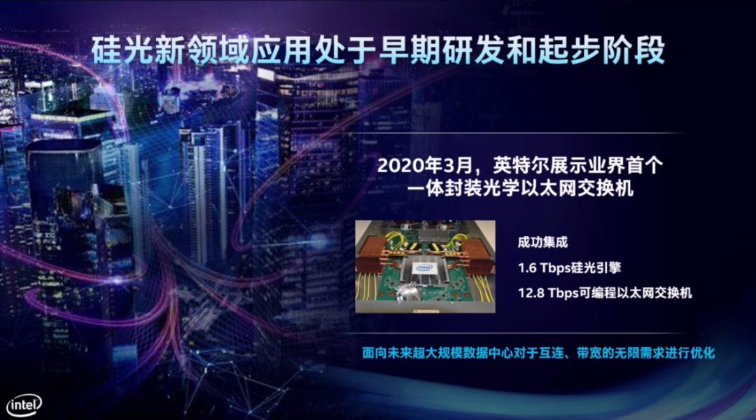 關(guān)于近內(nèi)存計(jì)算,概念是指將數(shù)據(jù)在存儲層級向上移動,使其更接近計(jì)算部件。宋繼強(qiáng)稱之為未來數(shù)據(jù)處理最迫切的需求,尤其在AI計(jì)算方面。在硅光子技術(shù)研究方面,英特爾也很早布局。在今年3月,英特爾展示了業(yè)界首個一體封裝光學(xué)以太網(wǎng)交換機(jī)。它成功將其 1.6 Tbps的硅光引擎與 12.8 Tbps的可編程以太網(wǎng)交換機(jī)進(jìn)行了集成。