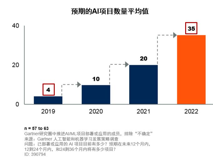 受訪者們還希望在未來12個(gè)月內(nèi)再增加6個(gè)項(xiàng)目,在未來3年內(nèi)再增加15個(gè)項(xiàng)目。這意味著在2022年,這些機(jī)構(gòu)預(yù)計(jì)平均有35個(gè)AI或ML項(xiàng)目就位。