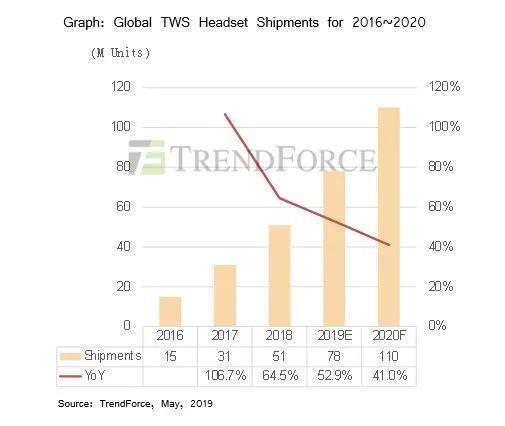 2016-2020年TWS耳機市場出貨量統(tǒng)計及預(yù)測。